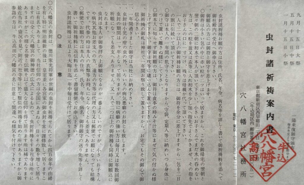 さらに調べたら、なんと東京の穴八幡宮というところでも、蟲封じの祈祷が受けられるらしい!