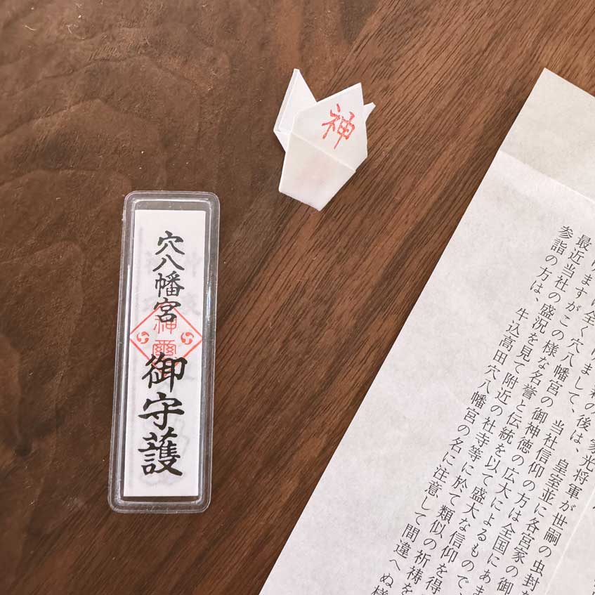 お宮参りとか七五三の祈祷の感じなのかなと思って、張り切って字の練習をしまくって初穂料の熨斗を用意したのだけど、穴八幡宮では祈祷はなく社務所でお金を払ってお守りと護符を渡された。